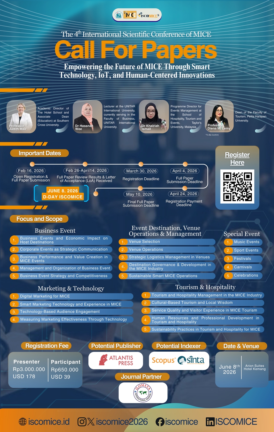 The International Scientific Conference of MICE (ISCOMICE) is an annual academic conference that brings together academics, researchers, and practitioners to discuss current issues, research, and innovations in the Meetings, Incentives, Conventions, and Exhibitions (MICE) industry. The conference is held annually and will continue to be organized in the coming years.